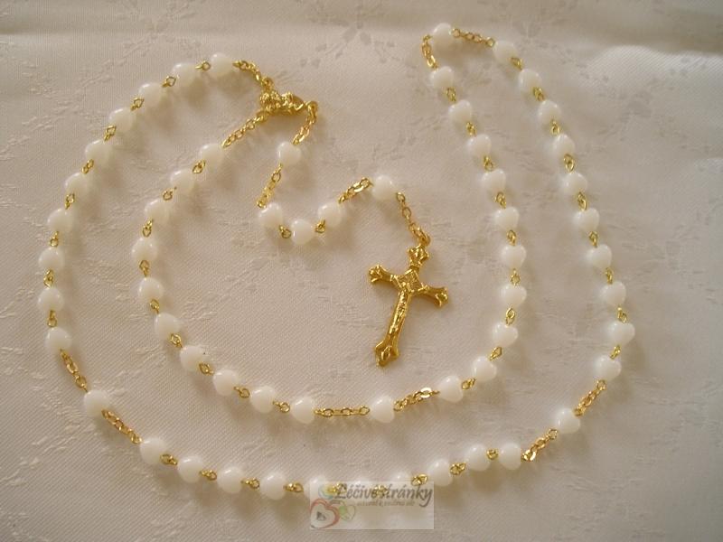 Růženec ze skleněných korálků na zlatěe - bílé-mléčné skleněné korálky ve tvaru srdiček.