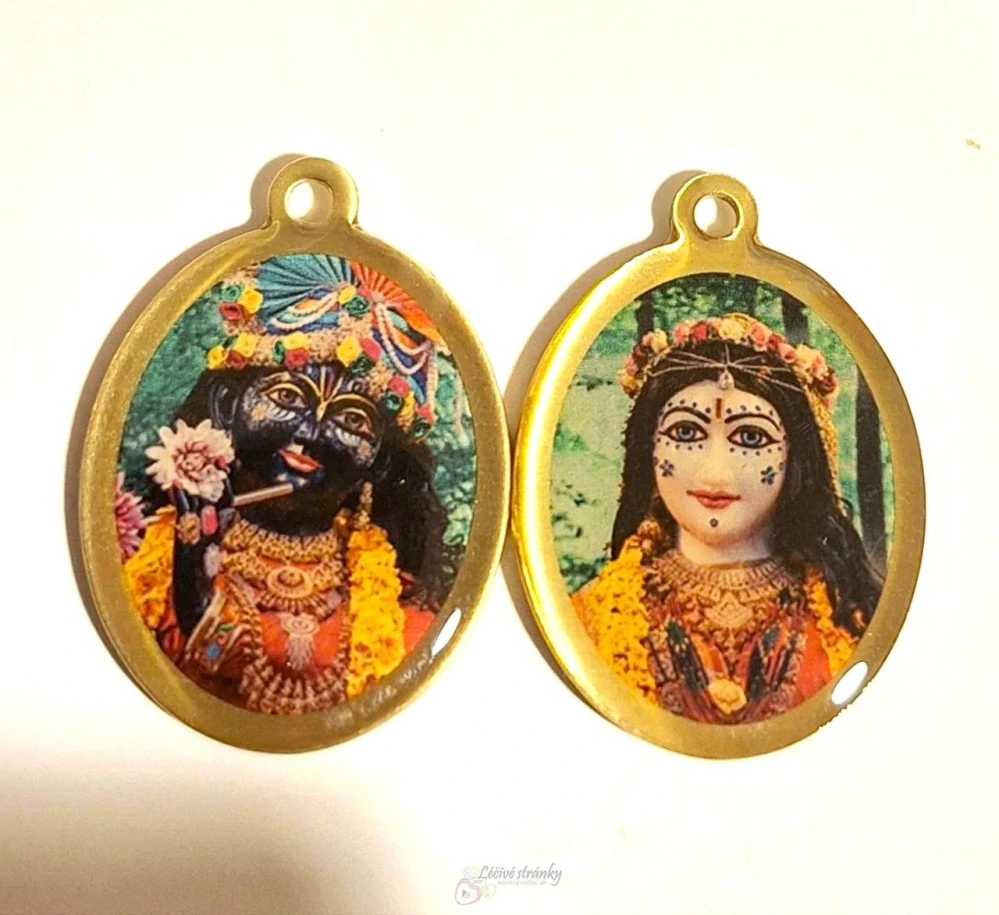 - Oboustranný medilonek. Z jedné strany fotografie Radhy a z druhé strany fotografie Krišny.